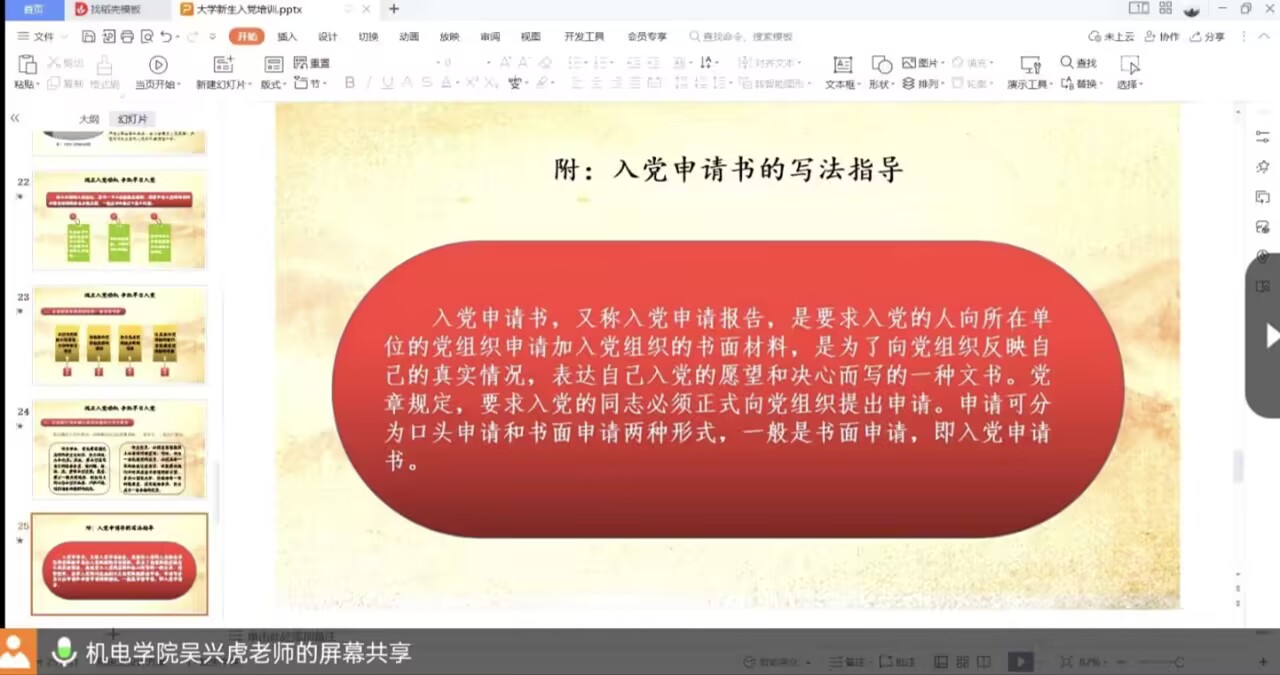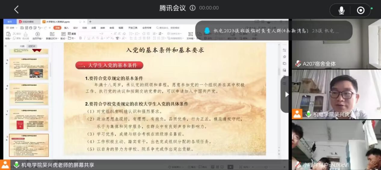 最后,针对如何写好入党申请书这一关键环节,吴兴虎老师做了认真指导:一是格式要正确。申请书一般包括标题、称谓、正文和落款。二是正文要充实。正文一般包括对党的认识、入党动机、入党决心和今后努力方向、个人和家庭基本情况。三是内容要与时俱进。要认真研读党章,及时学习党的创新理论最新成果,要联系自己的思想实际谈对党的认识,切忌照搬照抄,空话连篇。他希望2023级全体新生要扎实学习科学文化知识,努力进取,力争优秀;要善于利用大学的学习、活动来锻炼自己,提高自己的综合素质;要主动学习习近平新时代中国特色社会主义思想,不断增强“四个意识”、坚定“四个自信”、做到“两个维护”,以实际行动勇做新时代合格大员工。