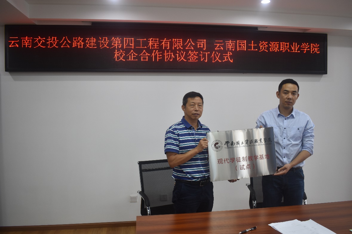 签约后举行授牌仪式,学院院长秦忠向企业负责人授予云南国土资源职业学院现代学徒制教学基地(试点)牌匾,双方表示未来将加大合作力度,多方位、多角度实现深度合作,促进共同发展。本次校企合作是双方深度合作的崭新起点,也必定会为各自的发展注入新的生机和活力。