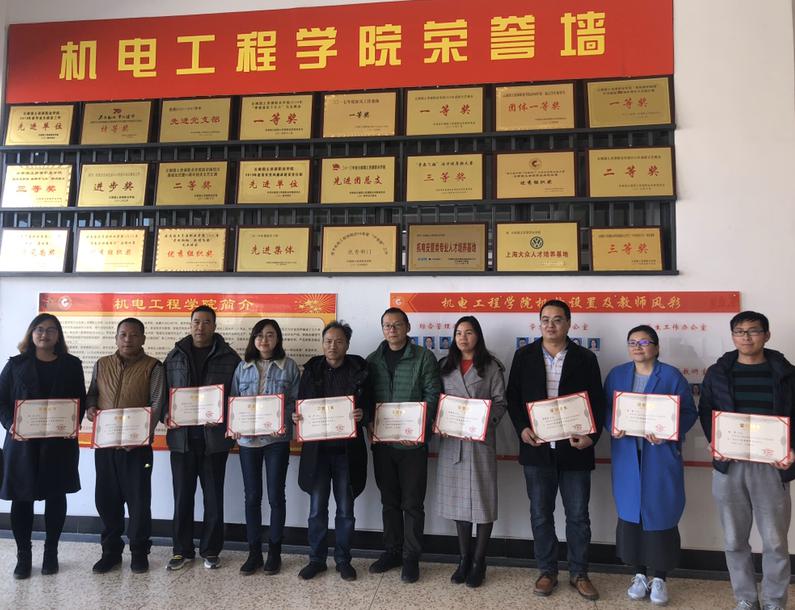 最后,学院院长秦忠老师对各教研室汇报中提出的问题和困难做一些回答,并传达了学校近期的一些会议精神,针对“以赛代考”、实验室设备采购等做相关说明。会议结束后,全体员工合影,张颖老师为2019年度学院“优秀员工”和“优秀教育工作者”颁发荣誉证书。