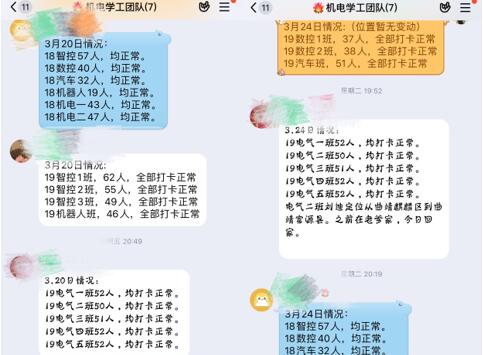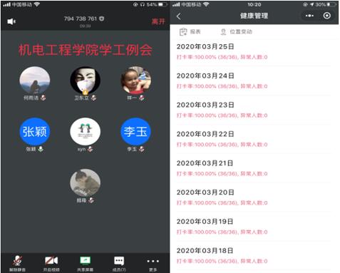 三是学工部门扎牢战“疫”安全墙,健康反馈不松懈。自2月28日起,学院全面启动微信平台“我在校园”师生健康打卡。学院各内设科室积极行动,及时进行师生健康状况全面排查工作。教职工健康打卡率一直保持100%。学工办进行疫情信息“零报告”,每日报备员工身体是否正常、是否返昆等信息,建立起学院健康监督体制、“党总支副书记-辅导员-班主任-班长团支书-舍长”五级人员管理机制。此外,机电学工团队在党总支副书记张颖老师的组织下,定期依托“腾讯会议”平台召开学工例会,讨论疫情期间员工管理工作以及复学前的准备。