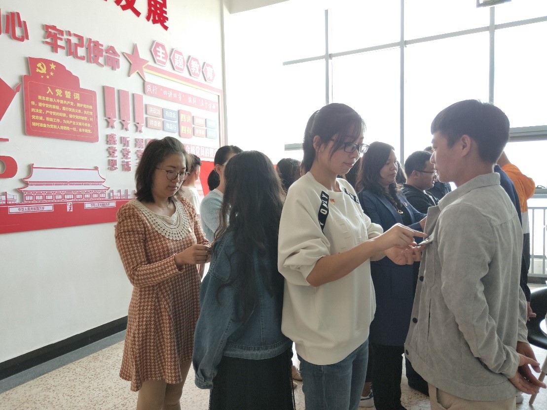 在第一党支部书记唐瑜谦的带领下,全体党员进行了入党宣誓。最后,各支部党员老师为新进党员同志佩戴党员徽章。至此,大会圆满结束。