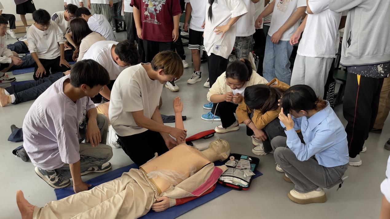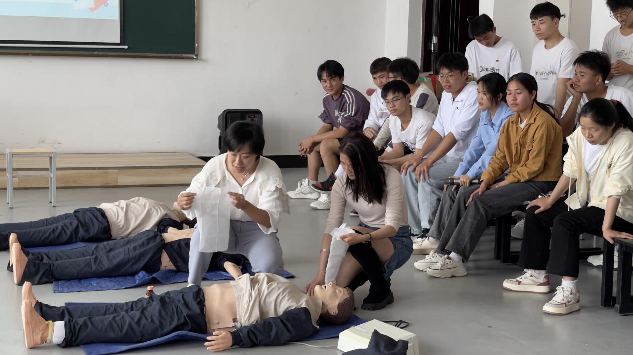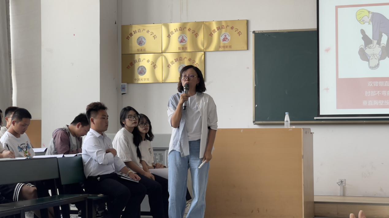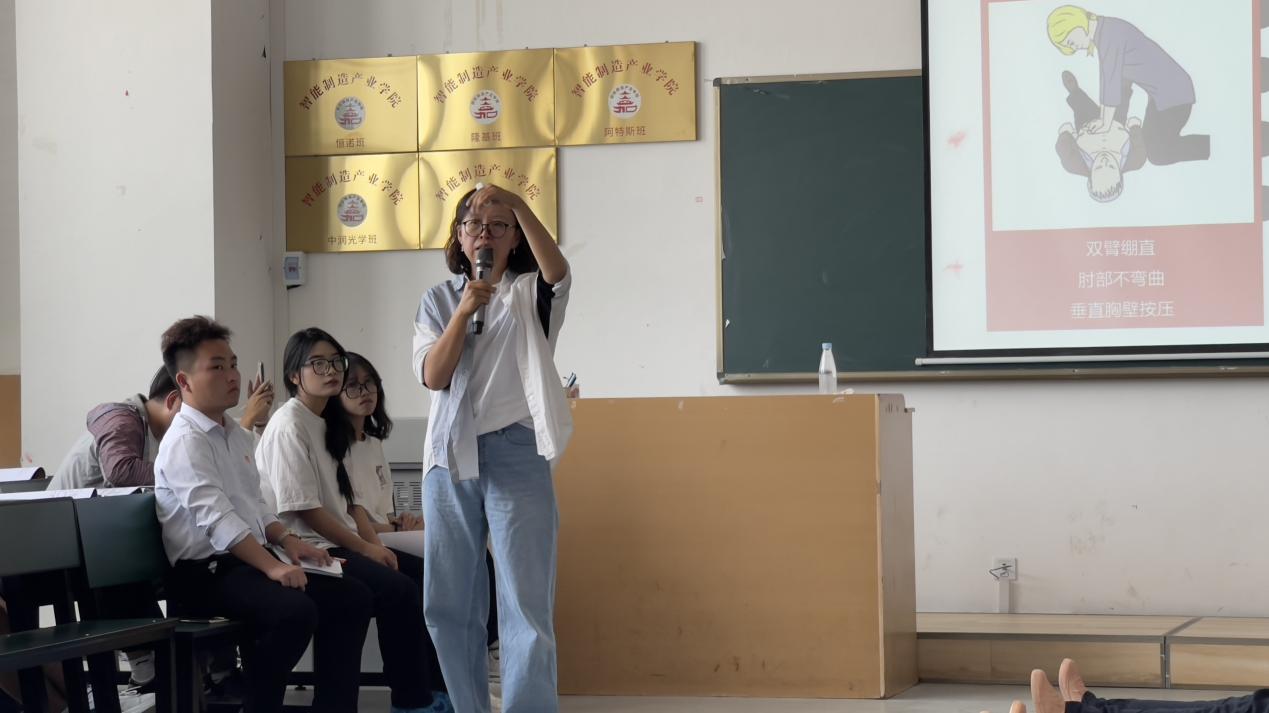 培训开始,刘芳芳老师为同学们讲授心肺复苏的相关知识,包括心脏骤停识别、胸外按压位置、手的按压方式、垂直按压和人工呼吸等相关知识,并指导同学们现场进行心肺复苏,进行正确的动作示范。同学们认真听讲、参与积极,较为系统地掌握了心肺复苏现场紧急救知识和正确处理方法,提升了紧急救护的能力。