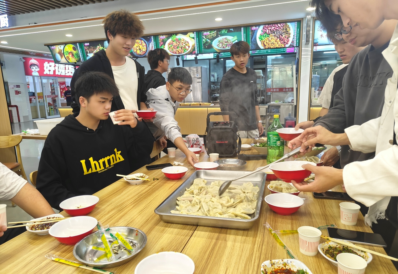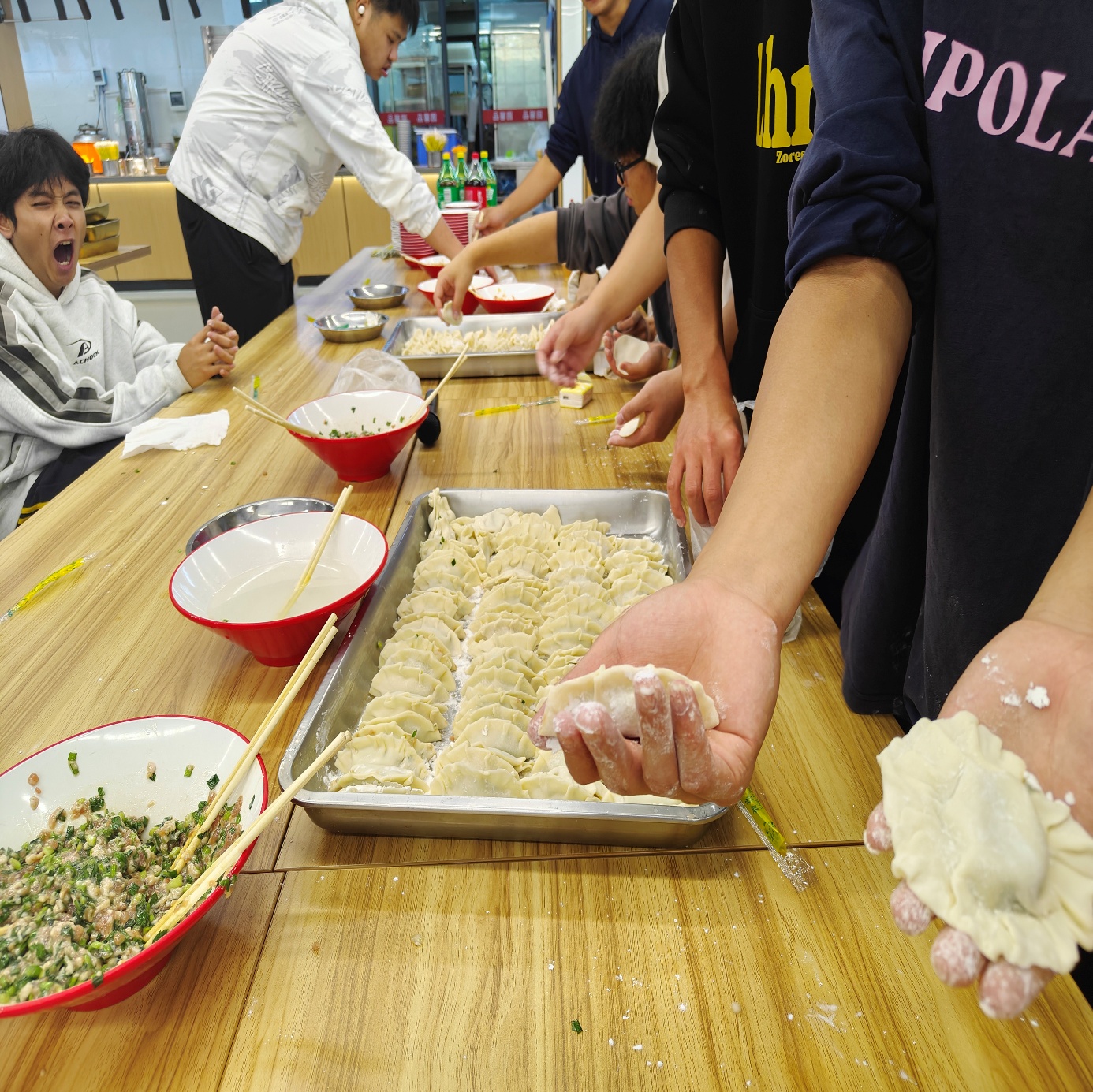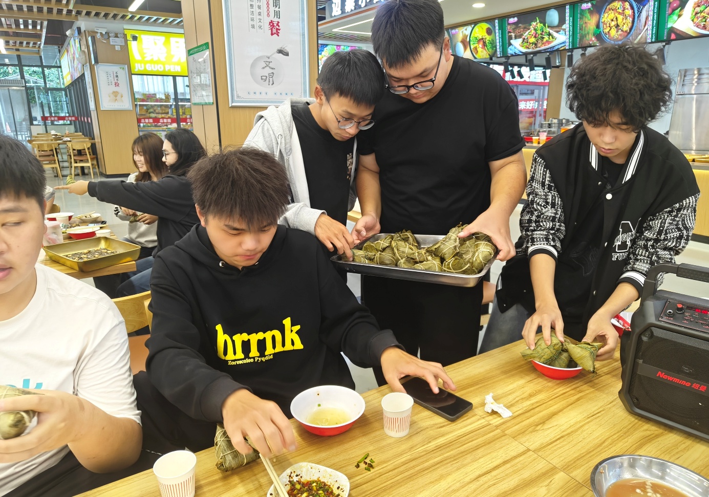 师生们围站在操作台前,巧手翻飞间,三角粽叶裹着晶莹糯米,月牙饺皮包住鲜美馅料。经验丰富的老师现场示范传统技法,同学们分组协作,从生疏到熟练,在欢声笑语中完成了200余个粽子和饺子的制作。当蒸汽氤氲中升起阵阵香气,大家品尝着自己的劳动成果,脸上写满成就感。
