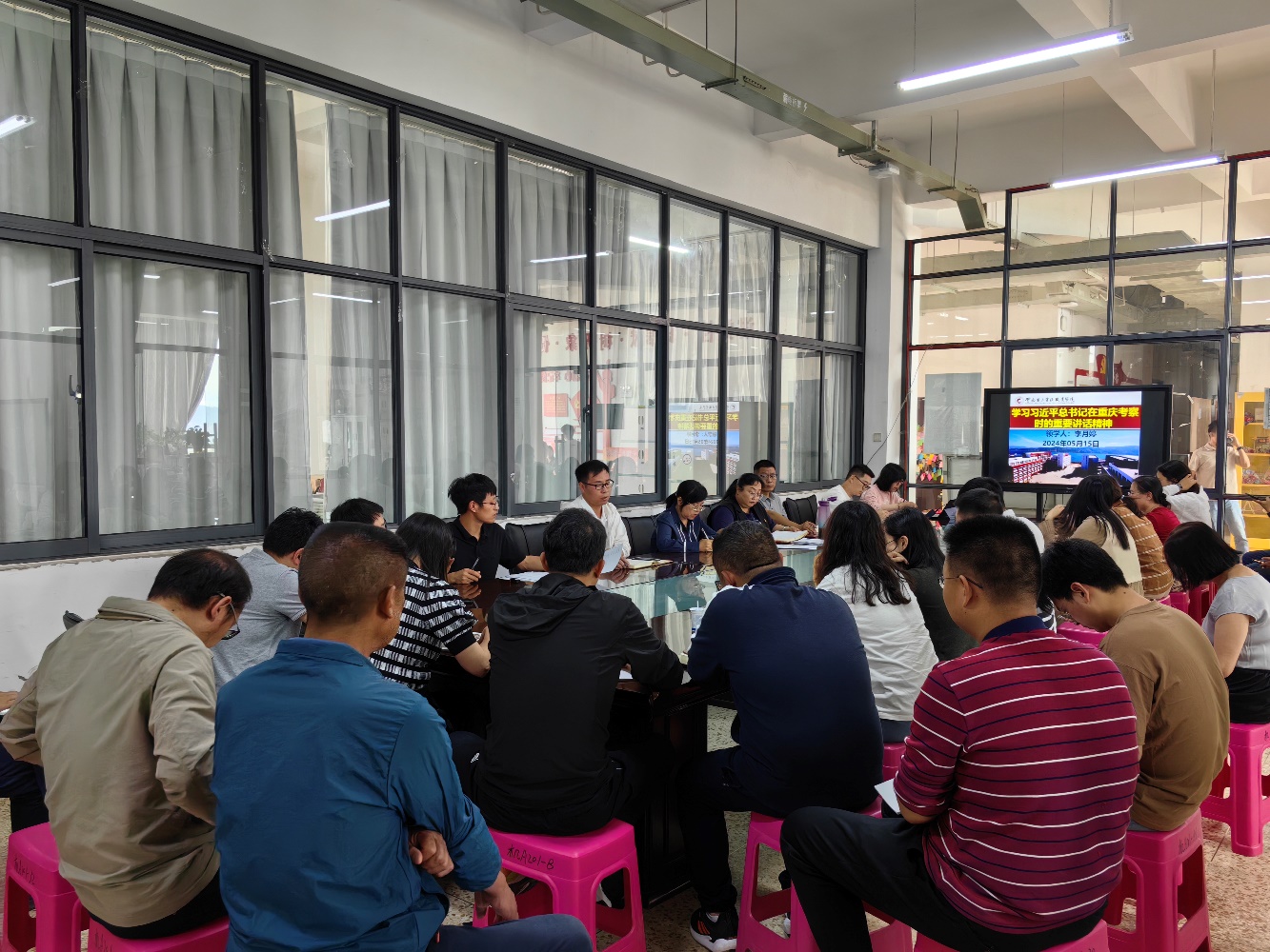 5月15日中午13:00,太阳成集团tyc7111cc在明尚楼A201开展了2024年5月份第一次教职工政治理论学习会。本次政治理论学习会由员工党支部宣传委员李月婷带领全体教职工学习了习近平总书记在重庆考察时的重要讲话精神。