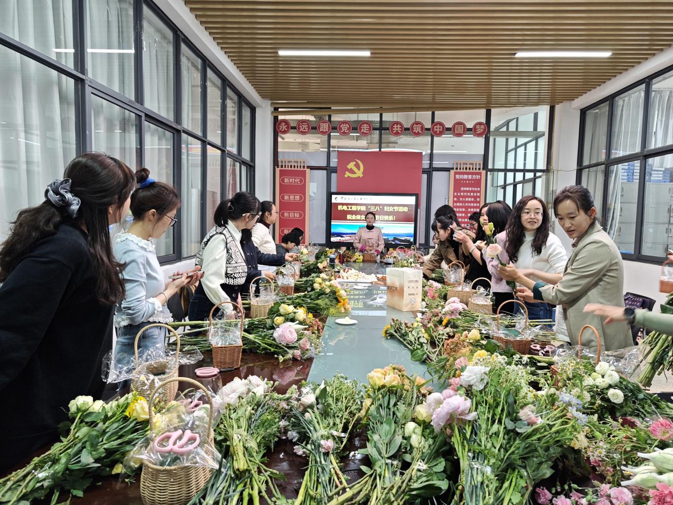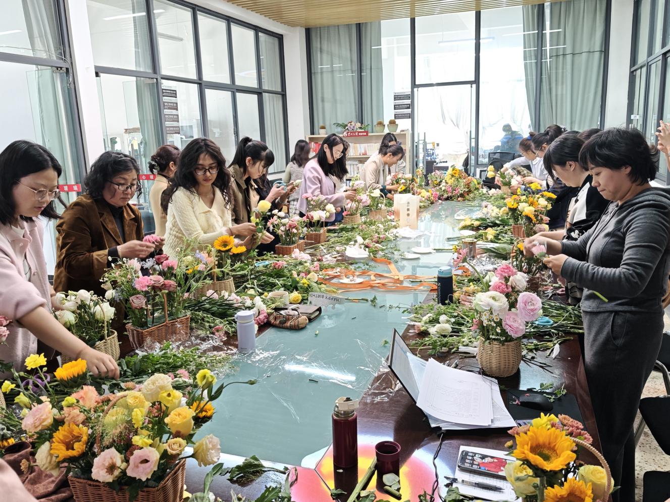 集体生日会后,学院还组织了插花活动。专业花艺师为大家讲解了插花艺术的基本知识、色彩搭配、造型技巧等,并现场演示了插花步骤。在花艺师的指导下,女教职工们发挥想象力和创造力,用心构思、精心搭配,将一朵朵鲜花错落有致地插入花篮中,制作出一个个独具匠心、赏心悦目的插花作品。活动现场花香四溢,充满着春天的气息,大家互相欣赏、交流插花心得,脸上洋溢着幸福的笑容。