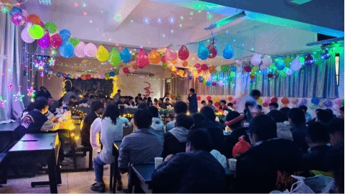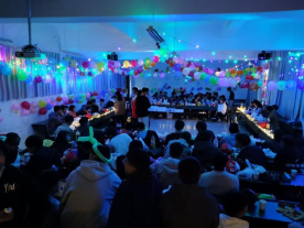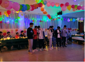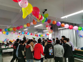 晚会开始前,两个班的同学们一起精心动手布置晚会现场,吹气球、挂彩灯、大家热热闹闹、有说有笑,班委们为大家准备了丰富的零食、水果、饮品并提前摆在了会场。