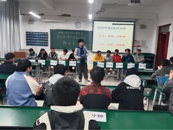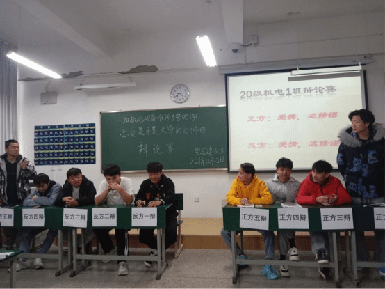 为丰富校园文化生活,引导同学们树立正确的恋爱观,结合教育性班会课程平台,12月22日上午8:50,2020级机电设备维修与管理1班在崇实楼605组织开展“恋爱是大学的必修课还是选修课”辩论赛。本次辩论赛由班长蒋枘兵主持,班主任夏雨露老师及机电一班全体同学共同参与。周顺达、杨淼、董银彪、刘开邦四位同学担任本次辩论赛的评委。