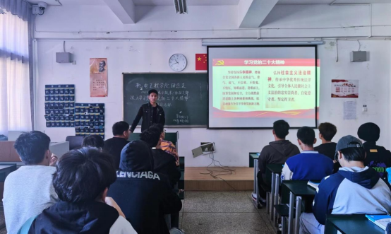 活动伊始,在施张蔡同学的带领下,同学们重温入团誓词,齐唱共青团团歌。接下来,团支部书记张立山带领着大家深入学习党的二十大精神。他指出党的二十大报告中有很多新思路,新观点,新举措,内涵丰富、思想深邃,同学们要在学懂弄通做实上下功夫,深入理解二十大精神内涵,深刻领悟社会主义法治精神、伟大建党精神、劳动精神、奉献精神、创造精神,坚定不移听党话、跟党走,做一个能担当民族复兴大任的时代新人。行动是最有力的宣言,实干是最有效的担当。张立山还带领着大家深入学习了11月从严治团的文件,他指出从严治团没有完成时,只有进行时,全体团员要坚持党的全面领导,坚持从严治团,与党同心,跟党奋斗,要遵守团员规章制度,不忘初心、踔厉奋发,用行动践行团员初心使命,用实干担当时代重任。