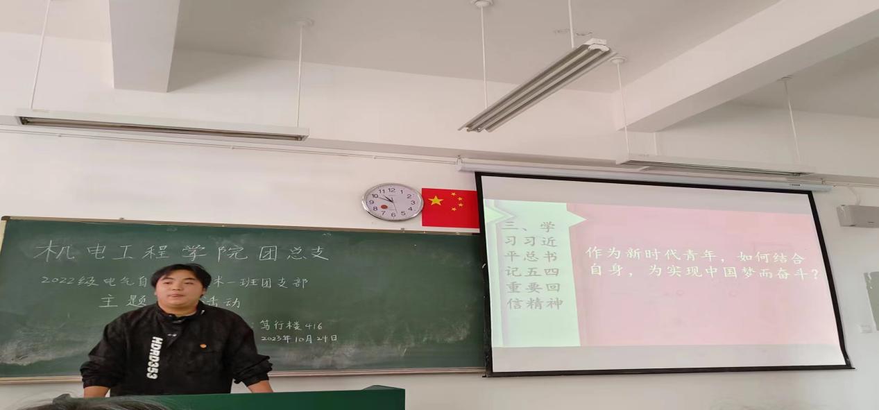 10月24日上午10:30,太阳成集团tyc7111cc2022级电气自动化技术1班在笃行楼416召开了“我向大家讲思政”主题团日活动。本次活动由2022级电气自动化技术1班团支部副团书记张银兵主持,全班同学共同参加。