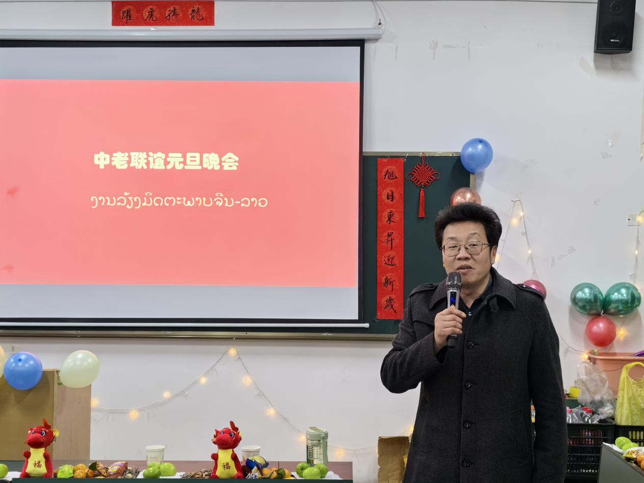 晚会伊始,副校长齐武福发言致辞。他对老挝学员的到来表示热烈欢迎,并为在场师生送上了新年祝福,希望大家在新的一年,事事顺心,身体健康!