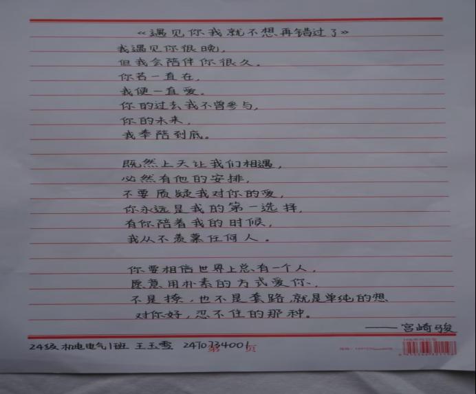 自古以来,书法不仅是文字的记录工具,更是情感的表达、哲理的阐述和艺术的展现,体现了中华民族对美的追求和对生活的理解。一横一竖,展现汉字之美,一撇一捺,点染人间繁华。一笔一画皆是情,一字一词都有意。在收回来的作品中,同学们字体美观大方,或清秀雅致,或舒展开阔,彰显了良好的书写习惯和深厚的书法功底。