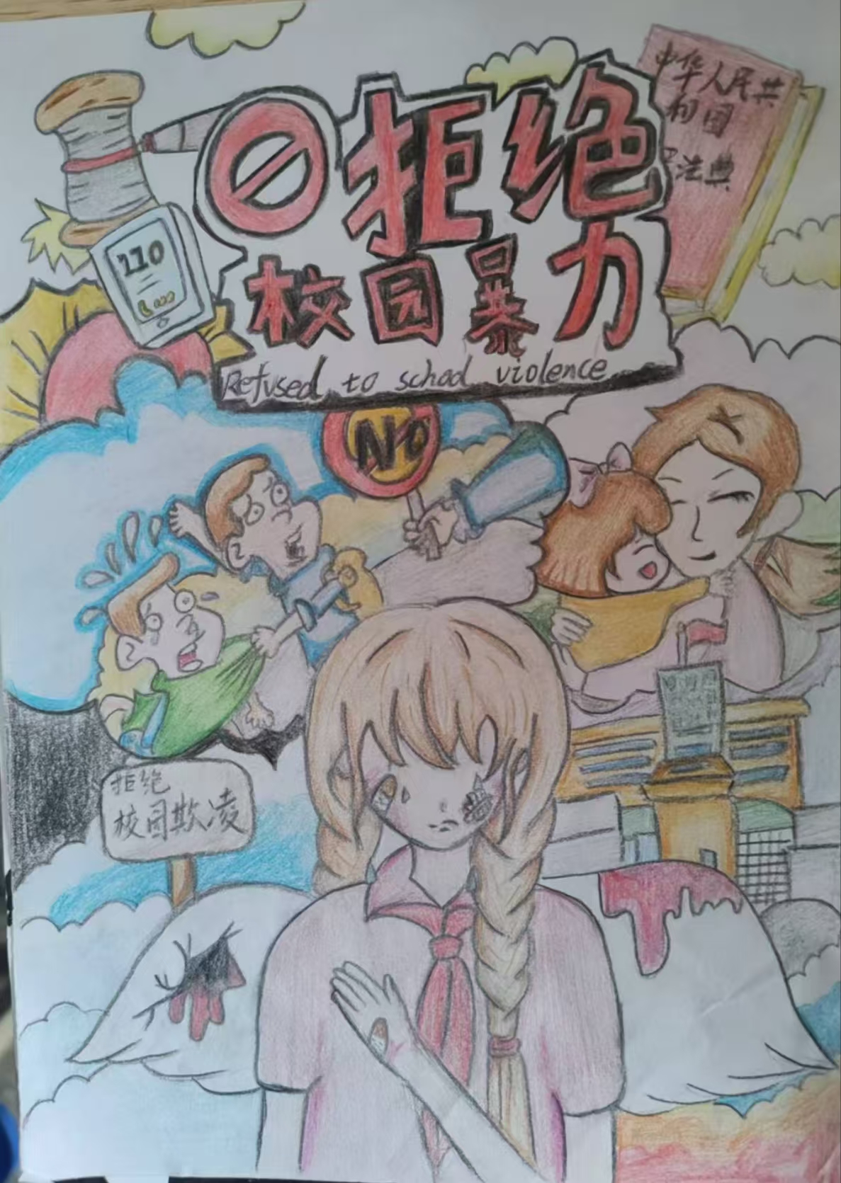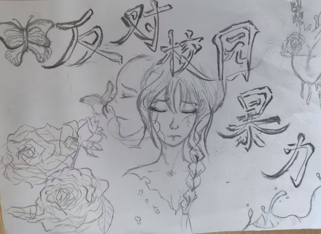 在活动过程中,同学们充分展现了自己的想象力和创造力,通过漫画、海报的形式,创作出了一幅幅生动的绘画作品。有的同学运用鲜艳的色彩,以直观而强烈的视觉冲击,描绘了校园欺凌的多种表现形式,如言语侮辱、肢体冲突、关系欺凌等;而有的同学则采用了细腻入微的画法,通过精心雕琢的细节,传递出深刻的情感,展现出了同学们团结一致对抗欺凌、互帮互助的美好愿景。