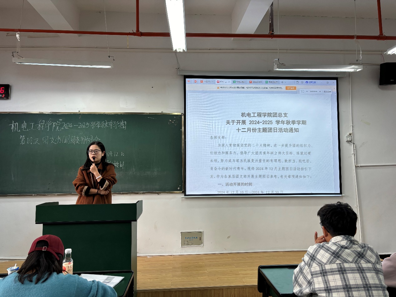 会议开始,马玲老师对12月份主题团日活动进行了详细安排部署,总结了11月份各班团日活动的开展情况并公布了各班上个月的得分。希望得分靠后的班级提前做好团日活动准备,提高班级活动出勤率,创新开展形式,按时提交相关活动材料。