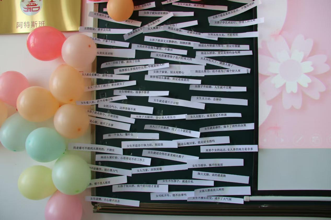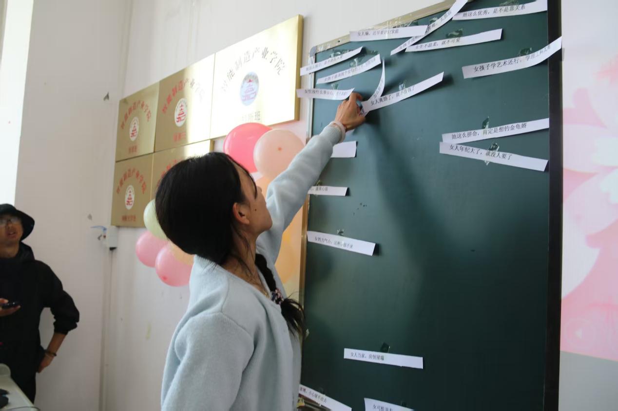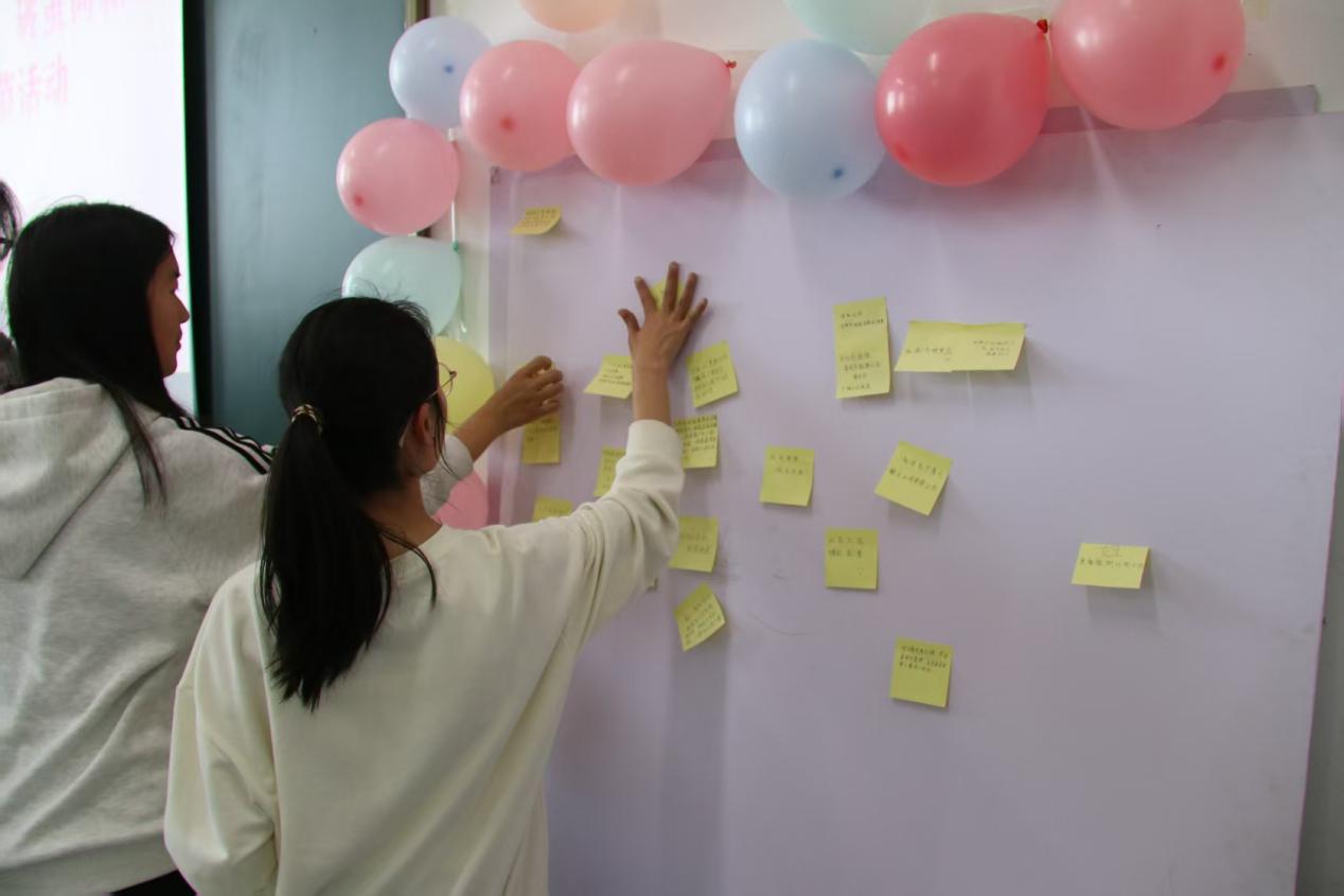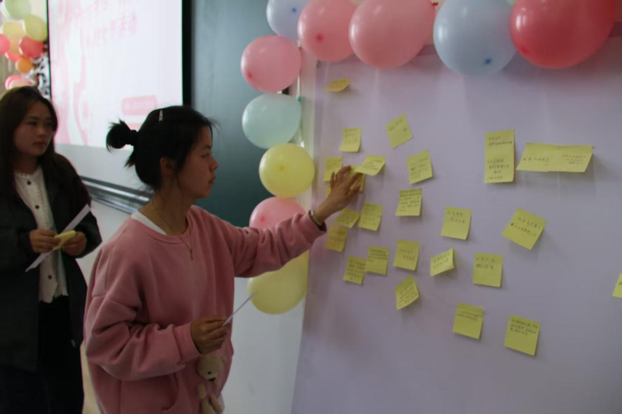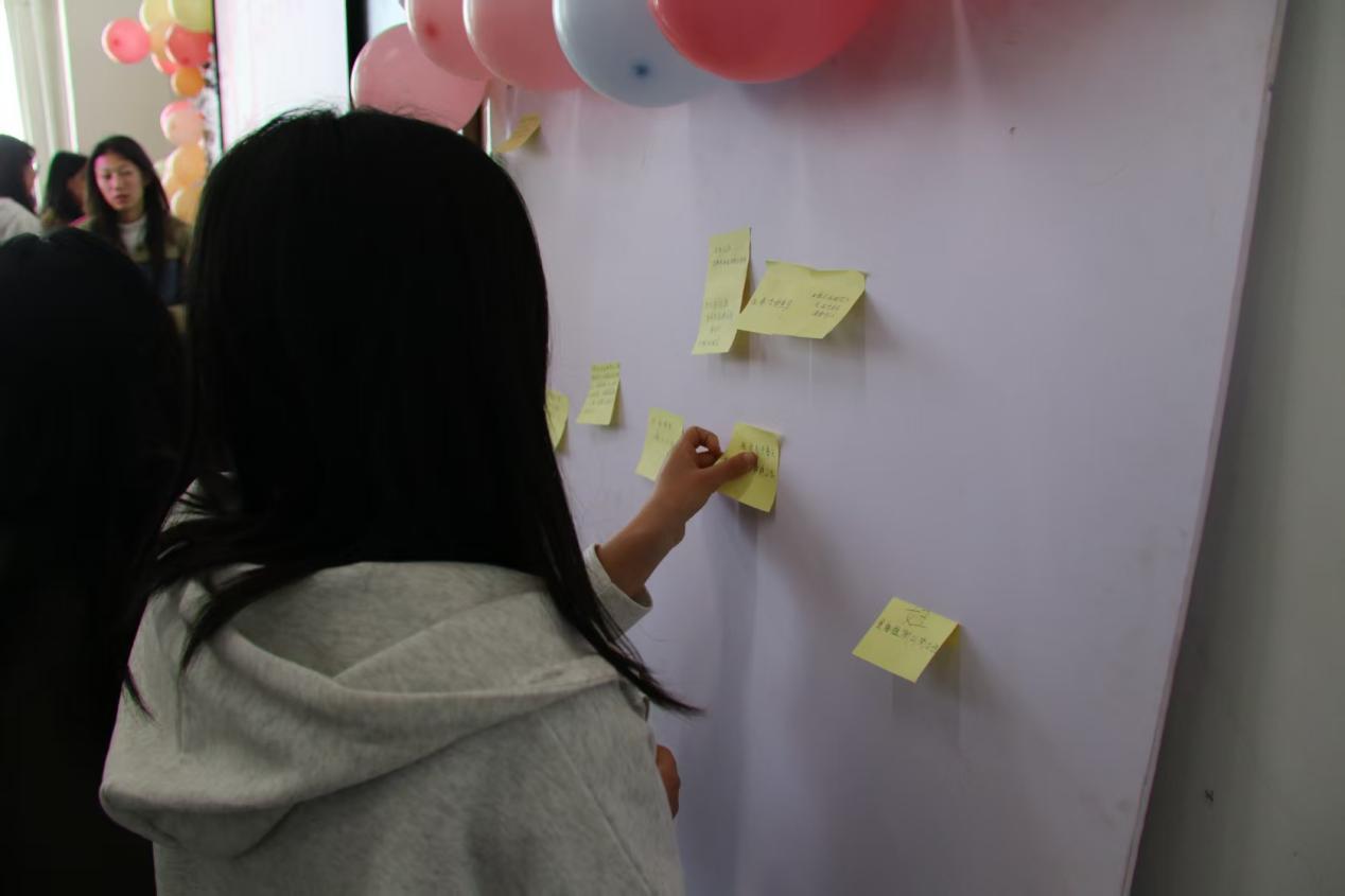 活动进入“撕掉标签,自己定义”环节。无论是为特定的“她”,还是向女性群体表达敬意,最真挚的祝福、最深情的赞美、最温暖的鼓励都被写在标签墙上。同学们相互交流,增进了彼此之间的友谊。她们分享着生活中的趣事和学习中的点滴,整个活动现场充满了欢声笑语。