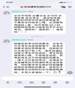 因疫情防控工作要求,本次专升本考试在工作的过程中,学院收到的临时通知较多,摸排员工信息多而急。学院多次组织召开2019级辅导员专项工作会议,要求大家全身心投入、全方位育人,向所有同学及时宣传党和国家疫情防控各项政策和举措,严格落实学校、学院疫情防控工作部署要求,着力守护员工健康安全,传递温暖与力量。