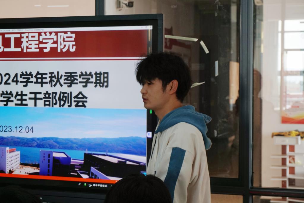 会上,首先由各个部门依次汇报上个月的工作情况。随后,全伟东老师对上月的团学工作进行了总结,指出各部门存在的问题以及改进措施。紧接着,安排了12月份各个部门的工作重点,同时要求各部门积极承办院级第二课堂活动,丰富机电学子的课余生活。最后,他指出:“作为一名员工干部,要时刻谨记自己的身份与责任,聚焦主责主业,明确岗位职责,找准定位,提高服务意识。此外,希望每个部门能够珍惜学院物资,规范物资借用制度,注意细节,责任落实到人,力求将各项工作做精、做细。”