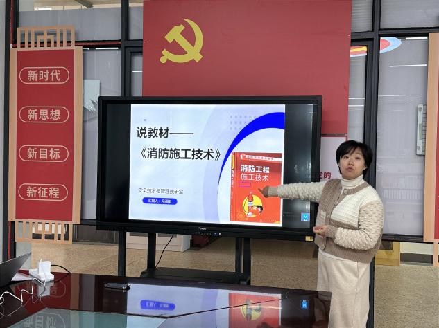 冯溪阳老师汇报《消防施工技术》课程,重点从编写说明、编写组织、编写计划、教材目录、教材内容编写等方面解说。